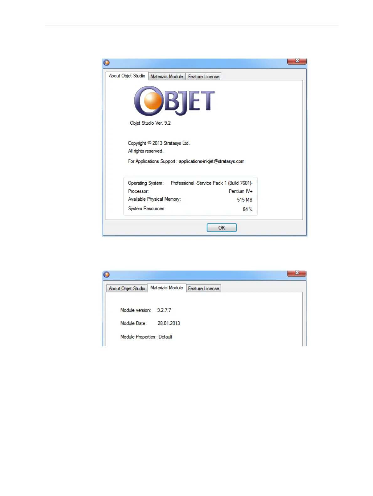 TheAbout Objet StudiotabshowstheObjetStudioversionnumberandbasic