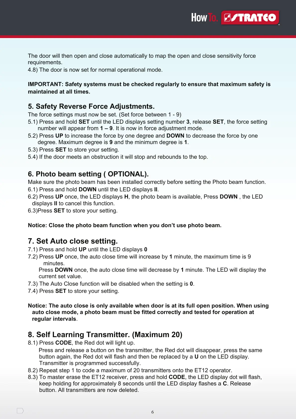 auto close mode, a photo beam must be fitted correctly and tested for operation at