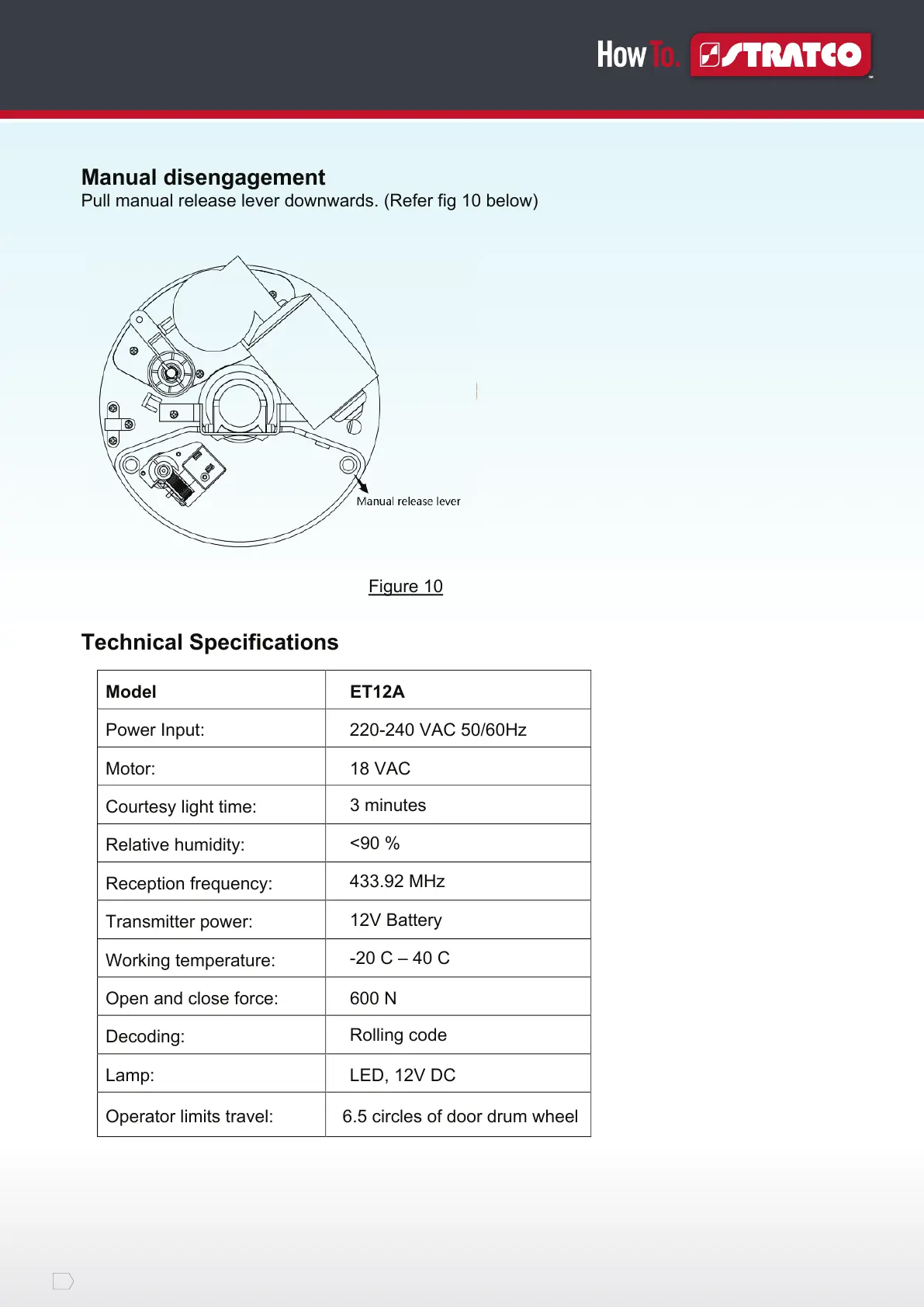 Stratco RDO12A - Manual Disengagement; Operating the Manual Release Lever; Technical Specifications; Product Specifications Overview