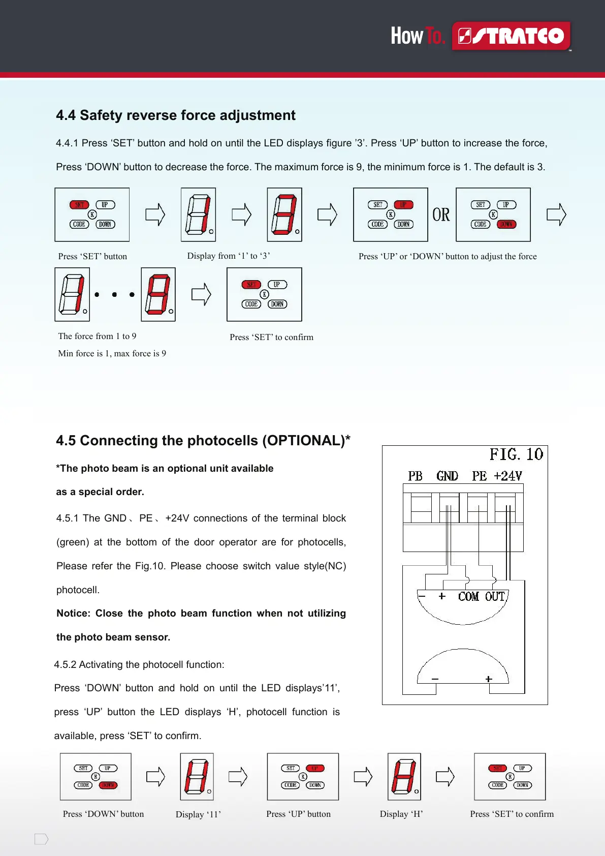 4.4.1 Press ‘SET’ button and hold on until the LED displays figure ’3’. Press ‘UP’ button to increase the force,