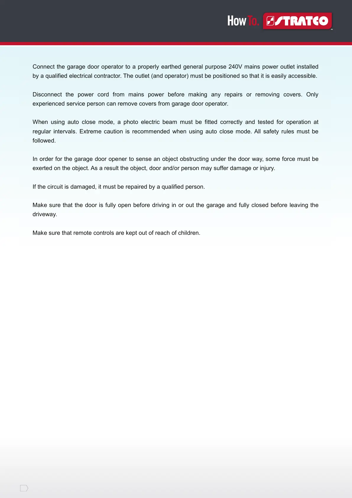 Connect the garage door operator to a properly earthed general purpose 240V mains power outlet installed