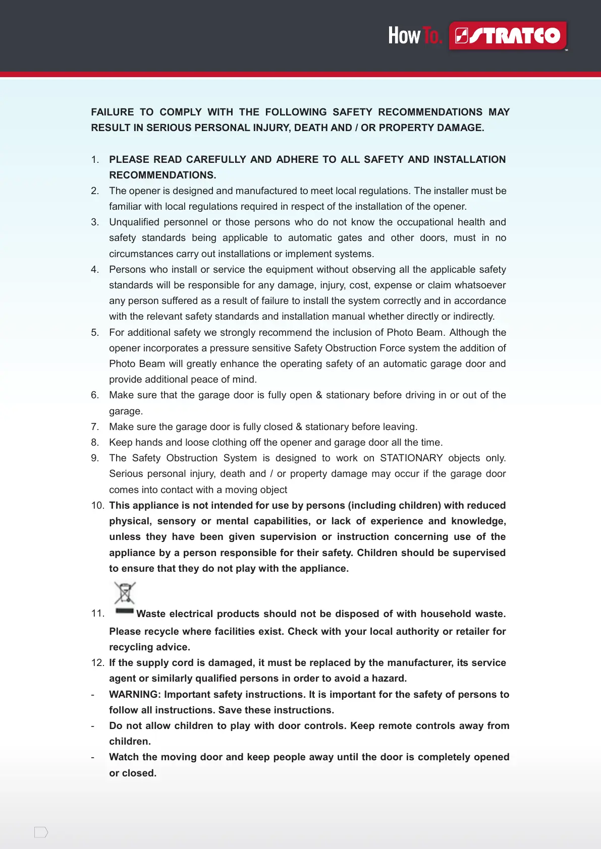 2. The opener is designed and manufactured to meet local regulations. The installer must be