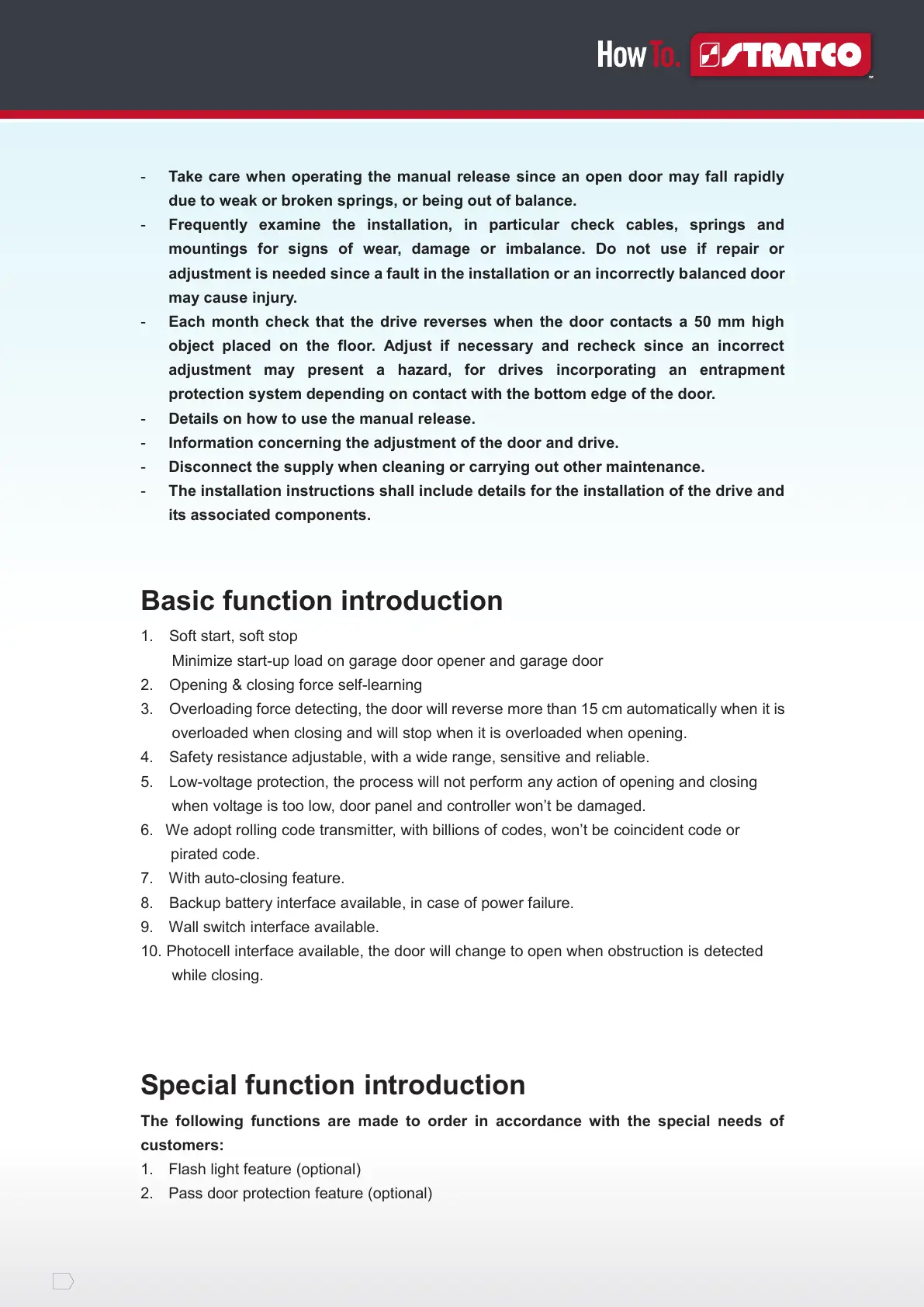 - Each month check that the drive reverses when the door contacts a 50 mm high