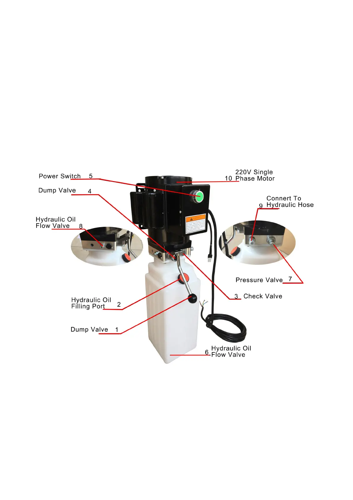 ◇ 8 Hydraulic Oil Flow Valve: Clockwise adjustment to speed up, counterclockwise adjustment to slow down.