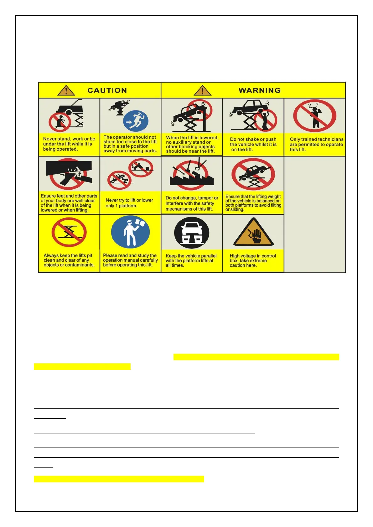 All safety warning labels are clearly depicted on the lift to ensure that the operator is aware of and avoids the dangers of