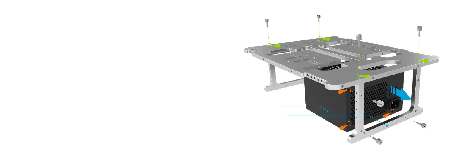 requires M3 or 6#32 threaded screws. The BC1 allows for both orientations of the PSU, so it