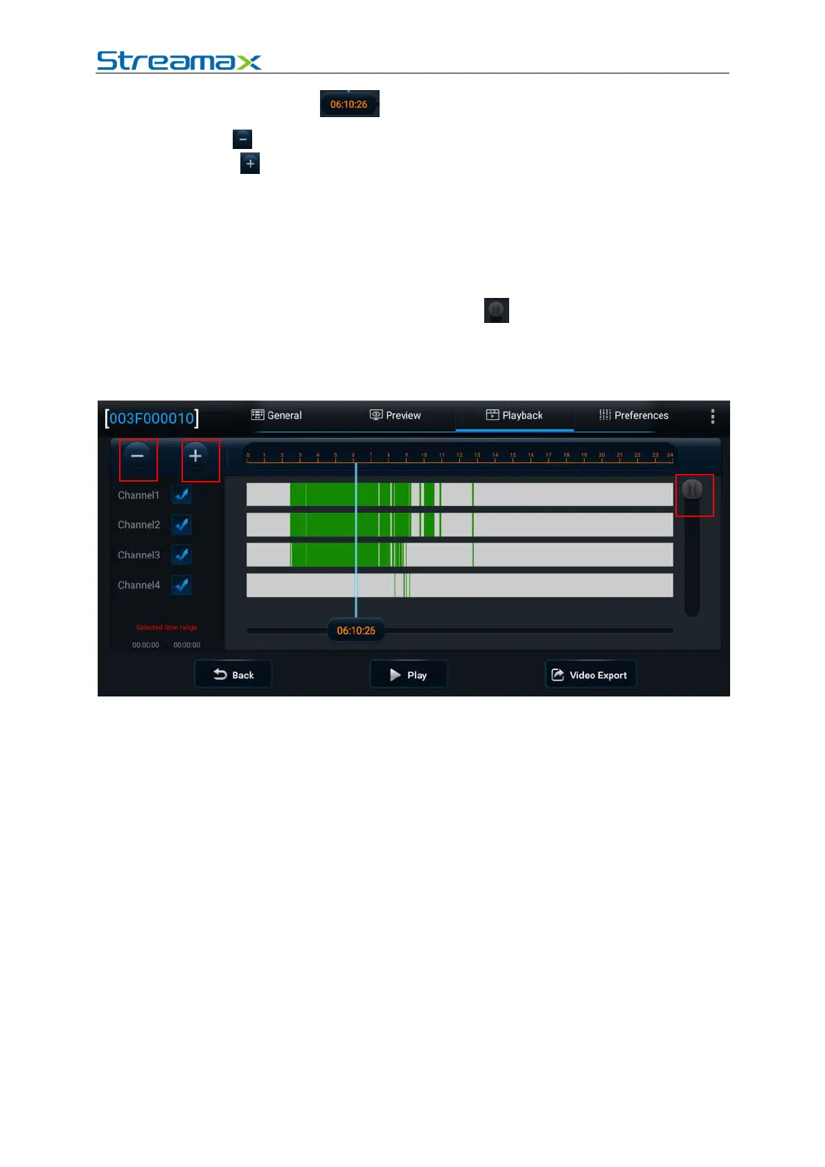 3) Check a channel (or more) and select the timeline(s) to playback or export the