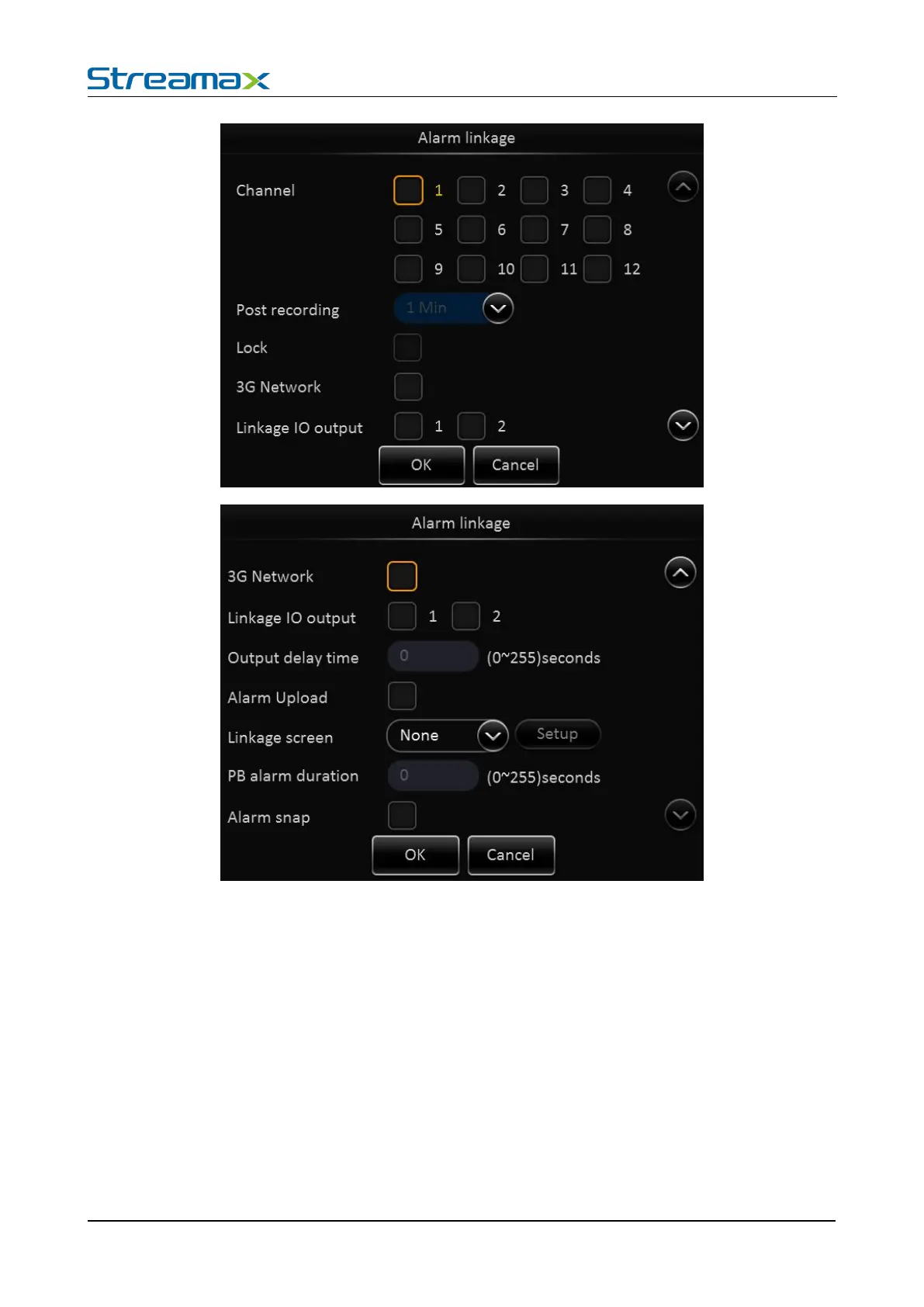 Linkage screen: Enable to link the channel to show full image when there is alarm. (Depends on the