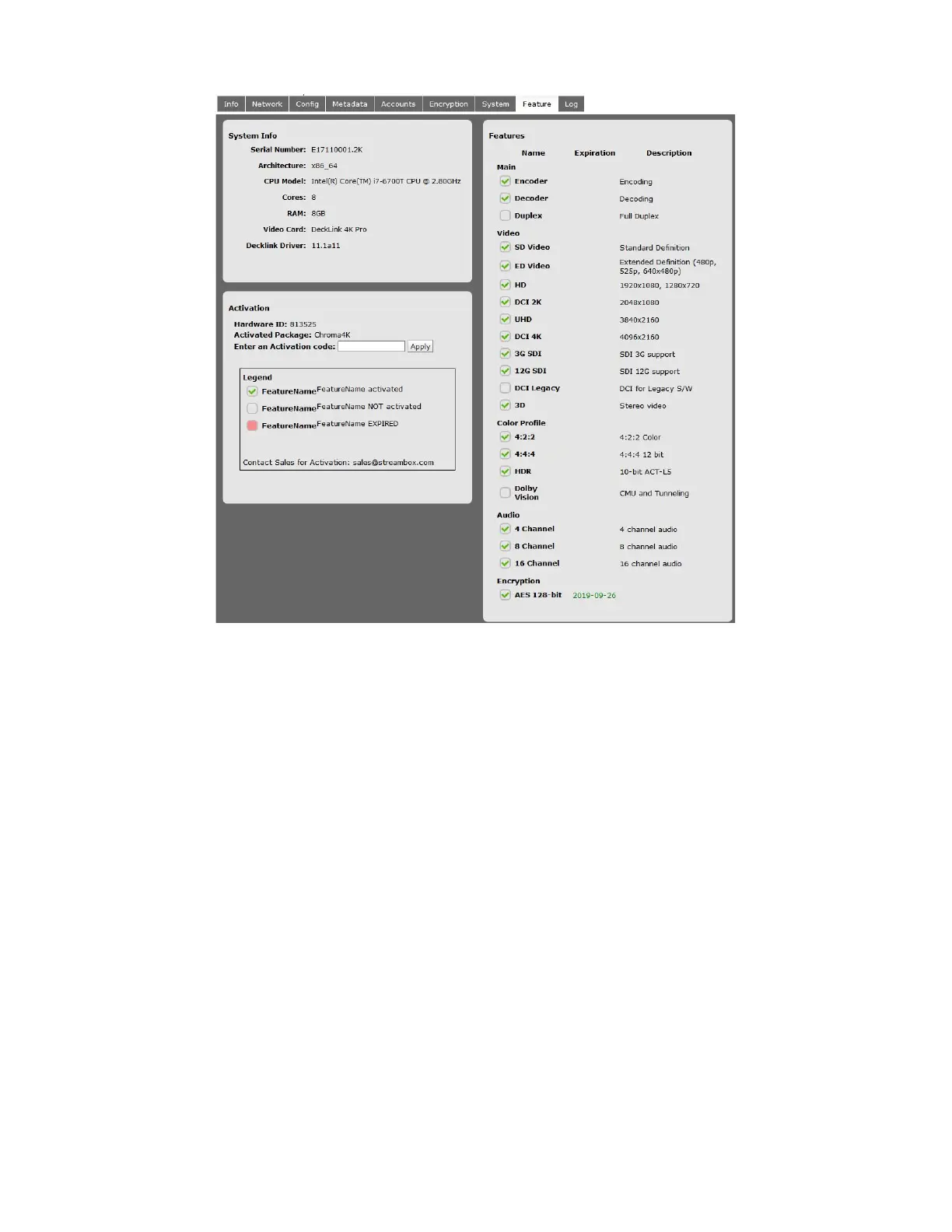 This section displays the Hardware ID of the Chroma, which will be needed by Streambox Support to create