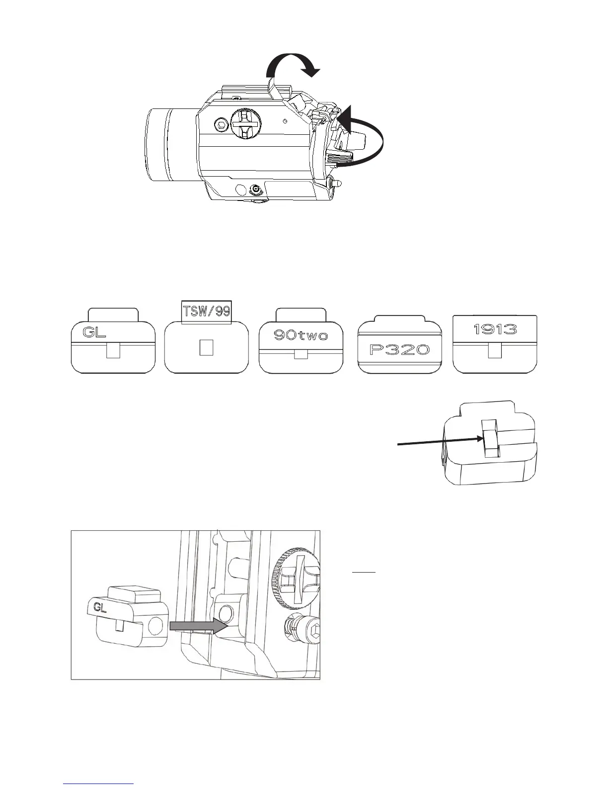 Cuatro llaves de riel de polímero (incluidas) permiten acoplar la TLR a diferentes armas de fuego: Rieles GL -