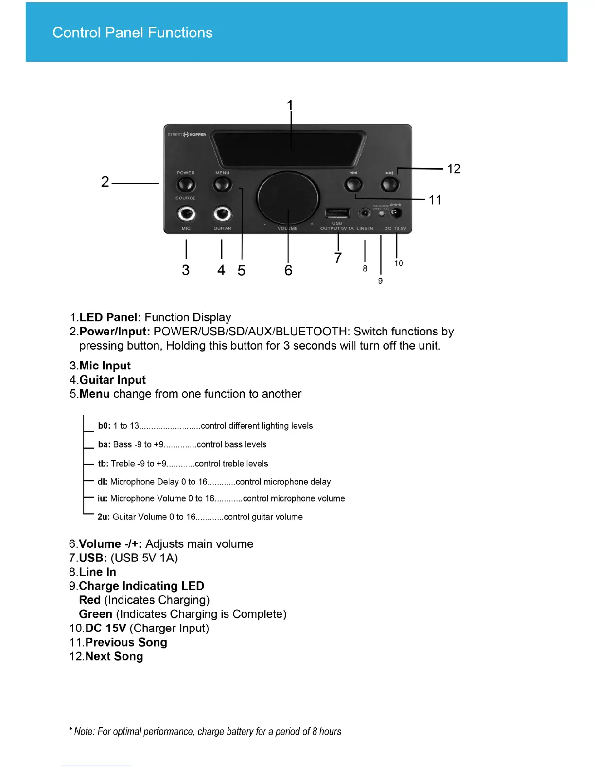 Street Hopper 6 - Control Panel Functions; LED Panel and Power;Input; Audio Input Ports; Menu and Volume Controls