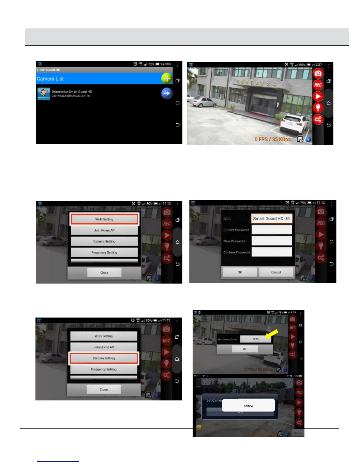 □ Select Camera Setting, click on the time to do the setting, once you see “Setting”, the time is updated successfully,