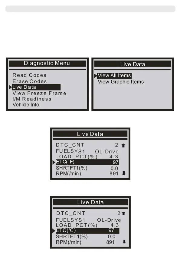 1) To view live PIDs on the screen. Use the UP/DOWN scroll button for more PIDs if an ⬆ or ⬇