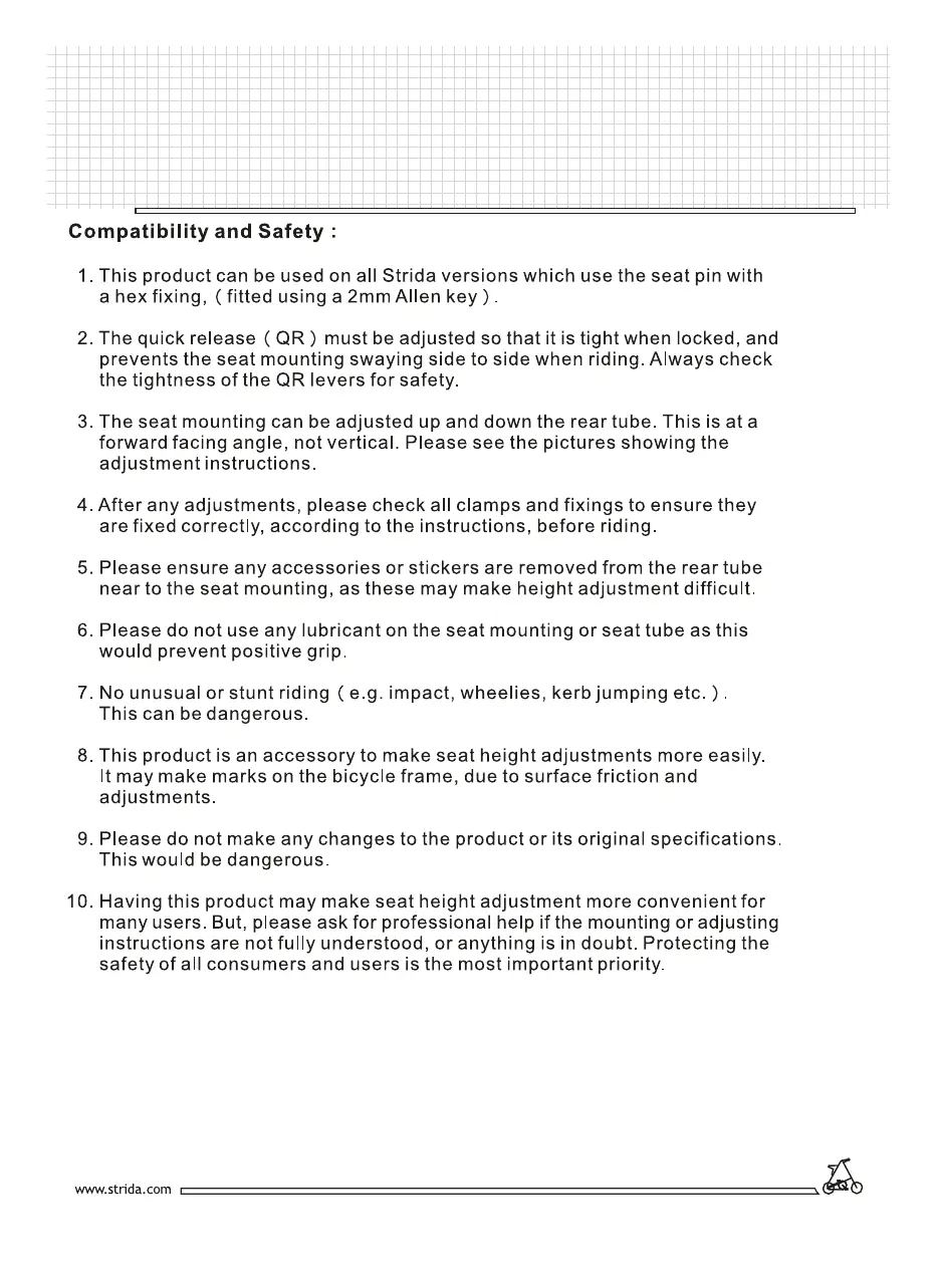 Strida 2018 - QR Seat Instructions; Compatibility and Safety Notes
