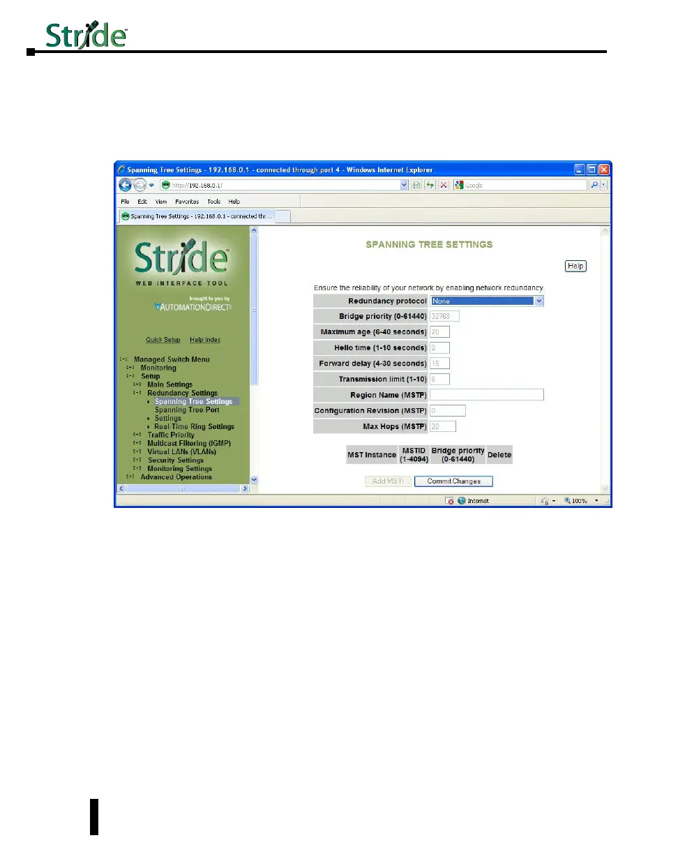 On the Redundancy Settings – Spanning Tree Settings page, set Redundancy protocol to “None”