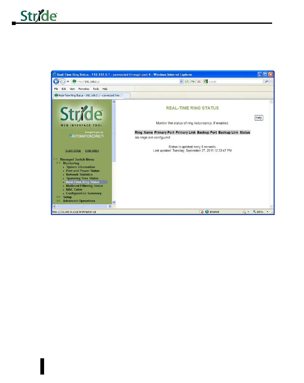 is disrupted). The Ring Status page shows the status of the Primary port, its Link status, the