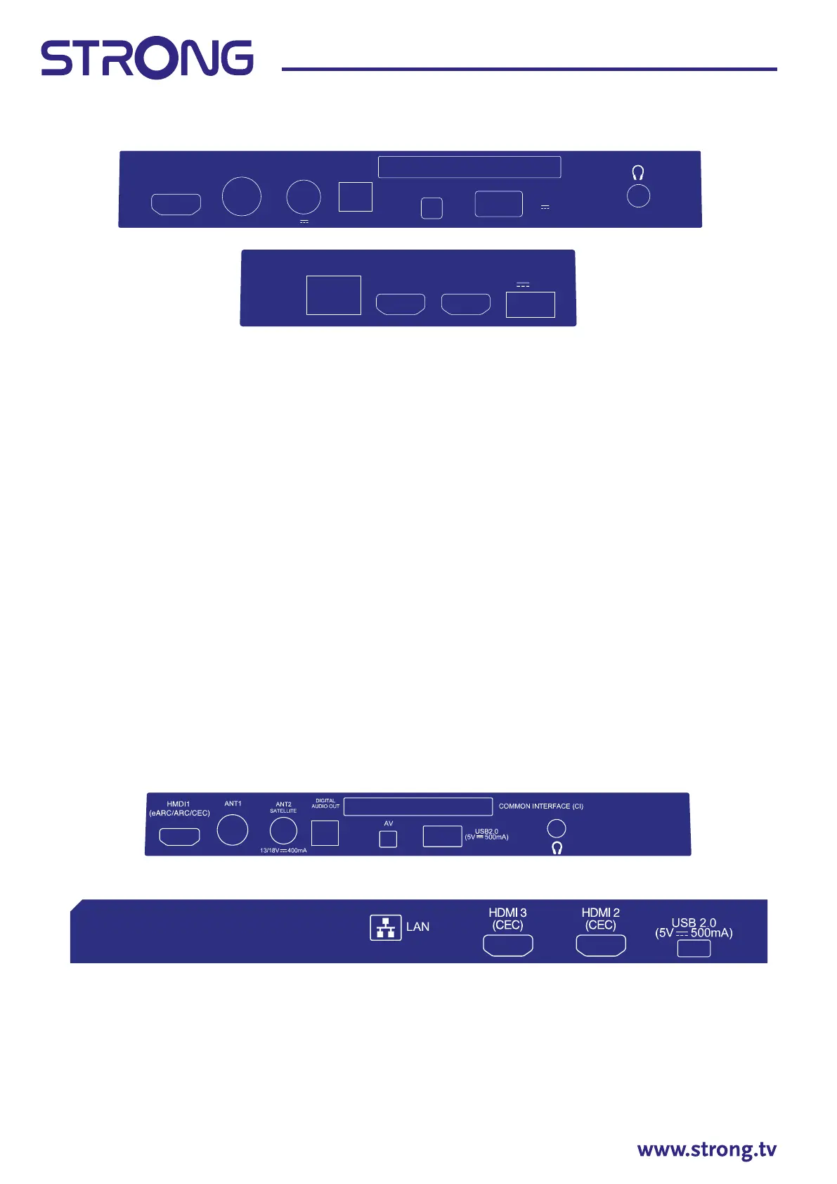 2. ANTENNA IN 1 Connect a coaxial cable to receive signal from the DVB-T/T2 antenna or DVB-C cable.