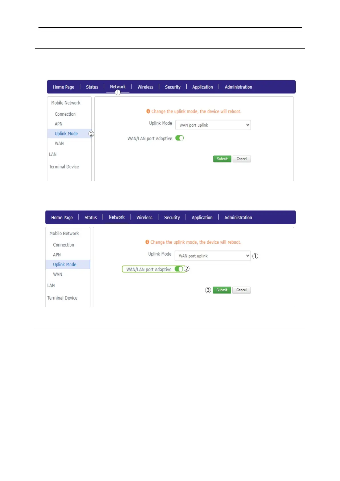 1. Select WAN port uplink and click the WAN/LAN port Adaptive toggle. Then, click Submit.