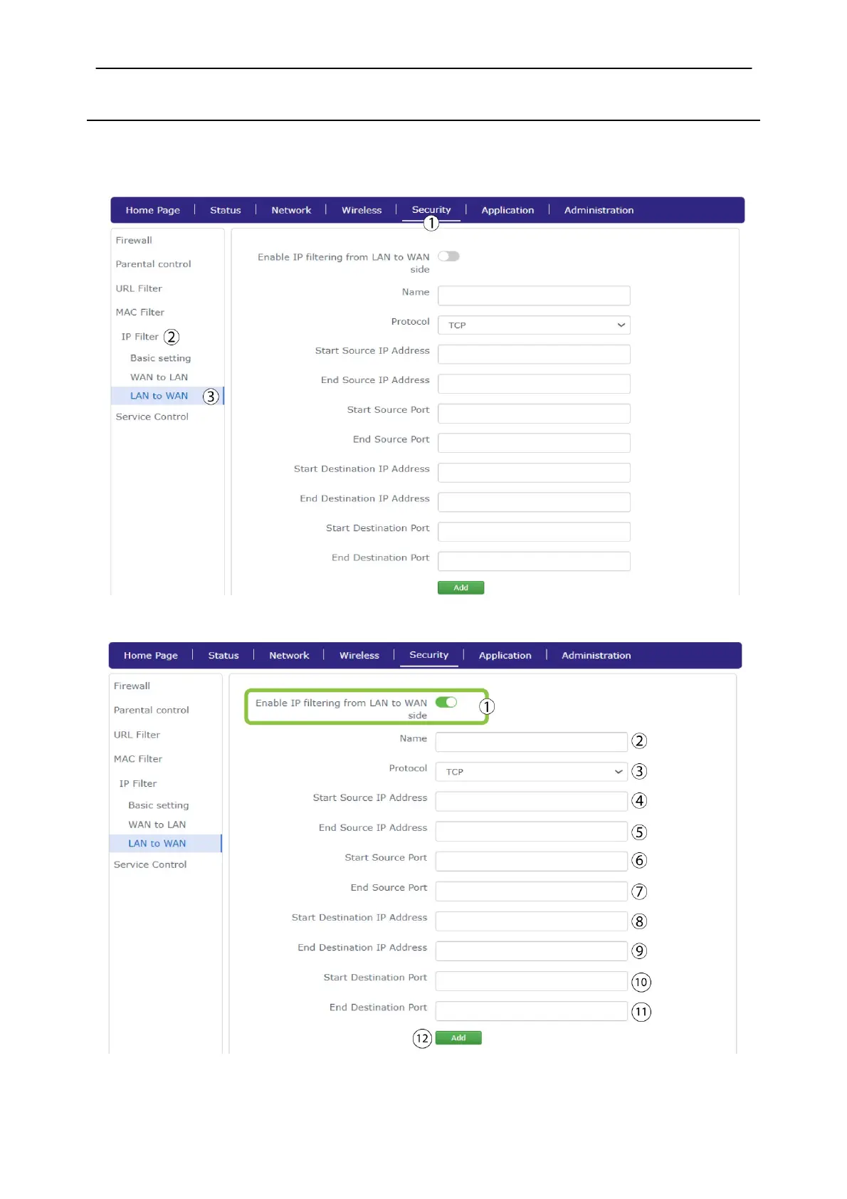 Enable IP Filtering from LAN to WAN toggle button, fill in the fields and click Add.