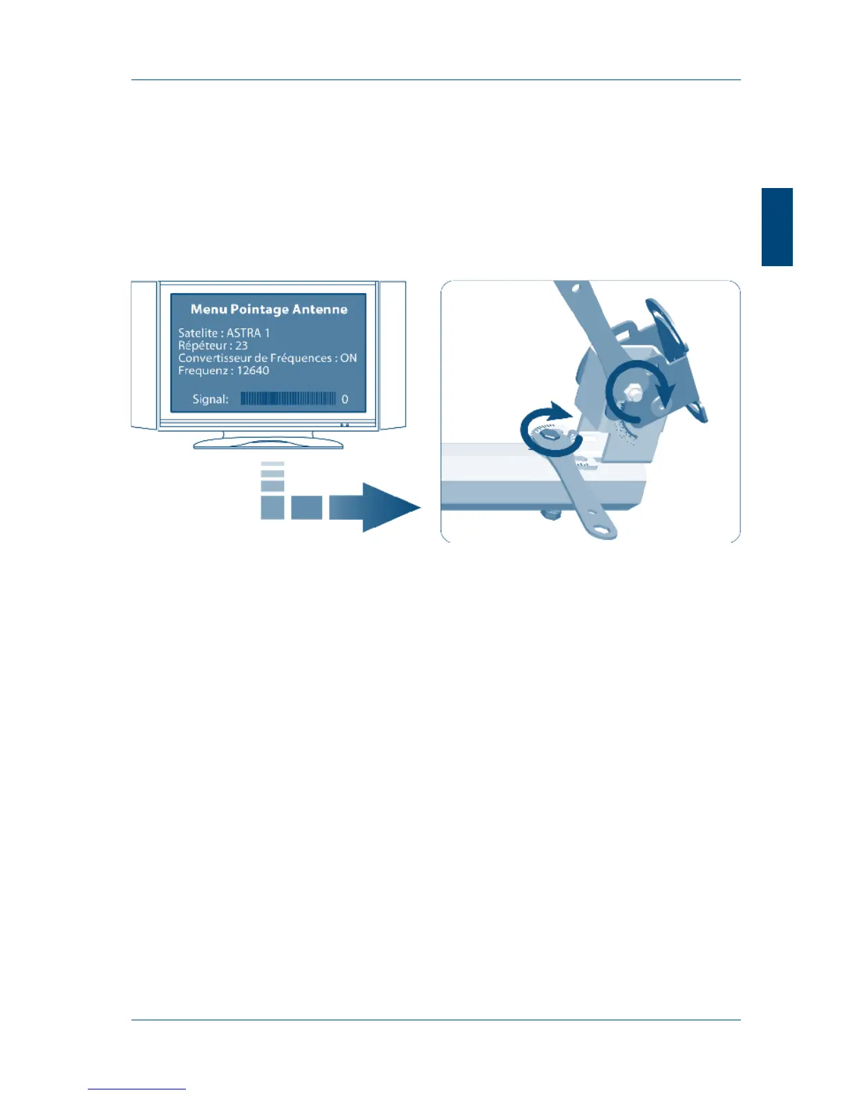 Once all connections are made, turn on the TV and the satellite receiver, select the Antenna Pointing