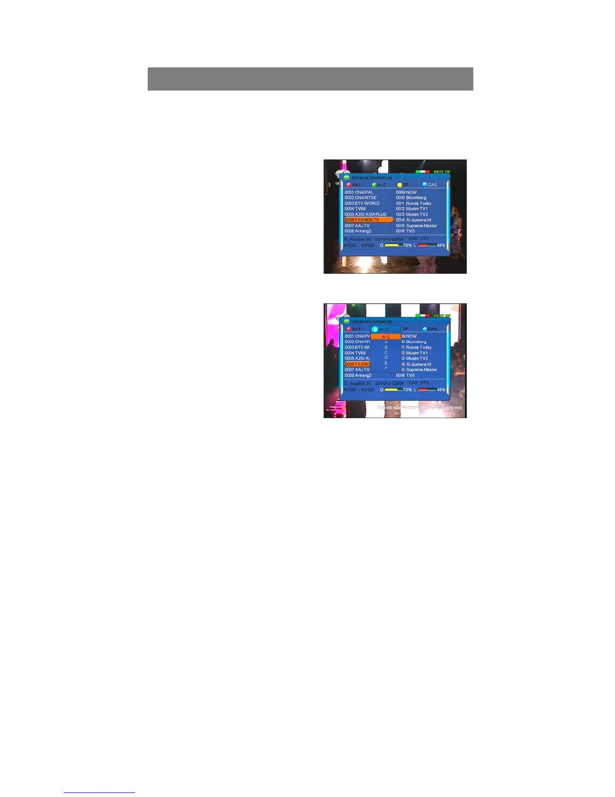 press ”CH”buttons to move in the list, and press “OK” button to select current