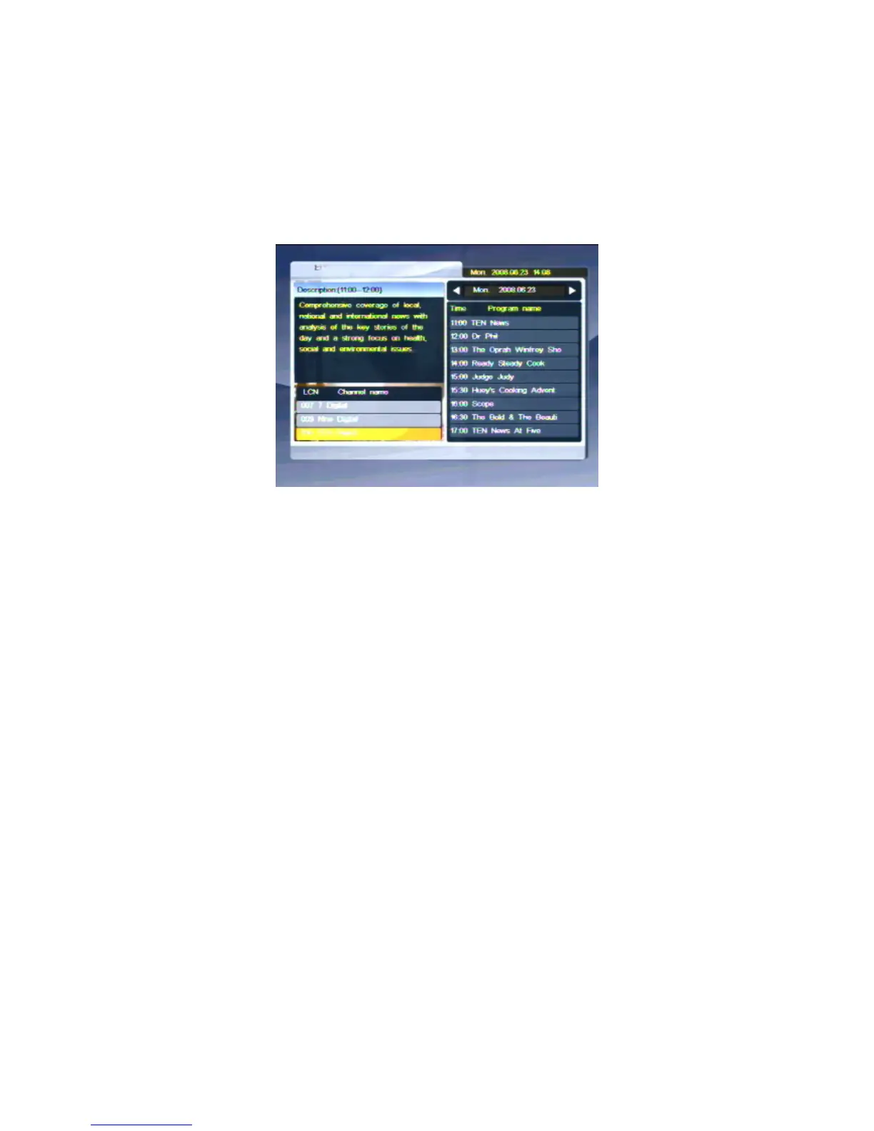 via an electronic program guide, displayed by pressing EPG on the remote control. An example is