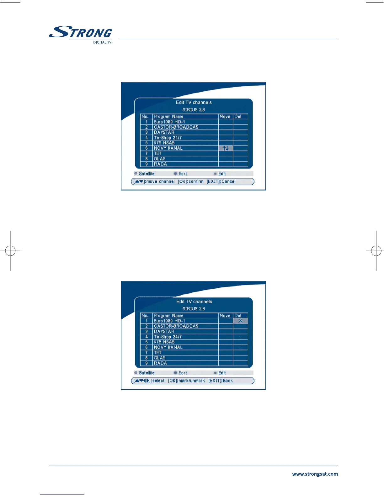 When the focus is on column “Del”, press the OK button to mark the channel as selected to be deleted