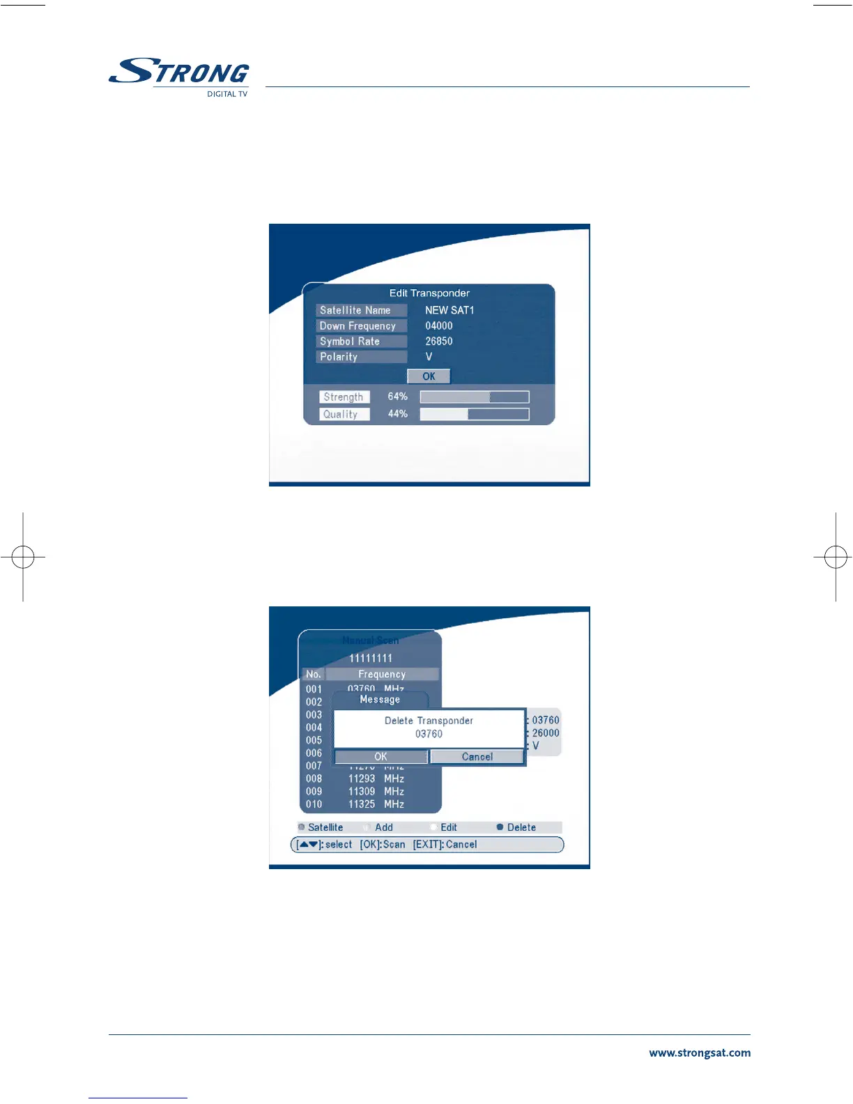 Press the BLUE button to delete a transponder. The warning massage will be shown as below.