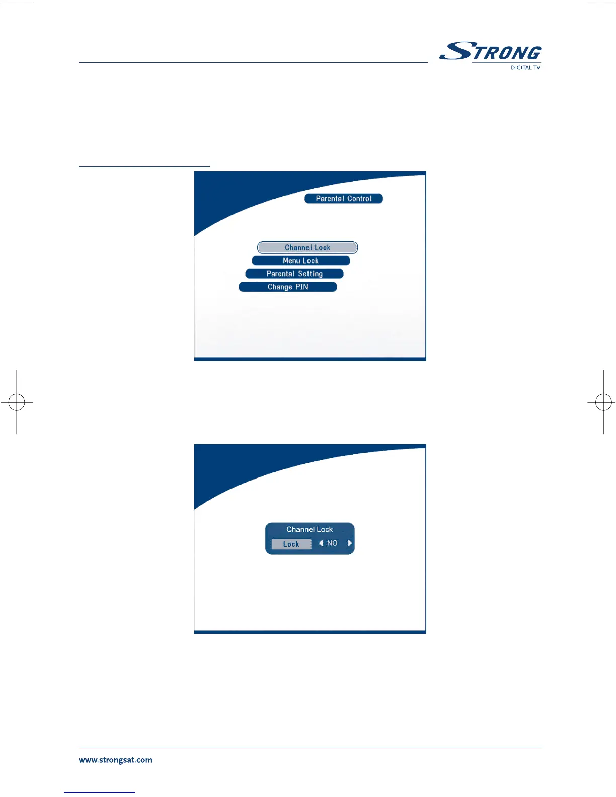 In this menu, you can set channel lock status (ON or OFF), the menu lock status, parental setting and