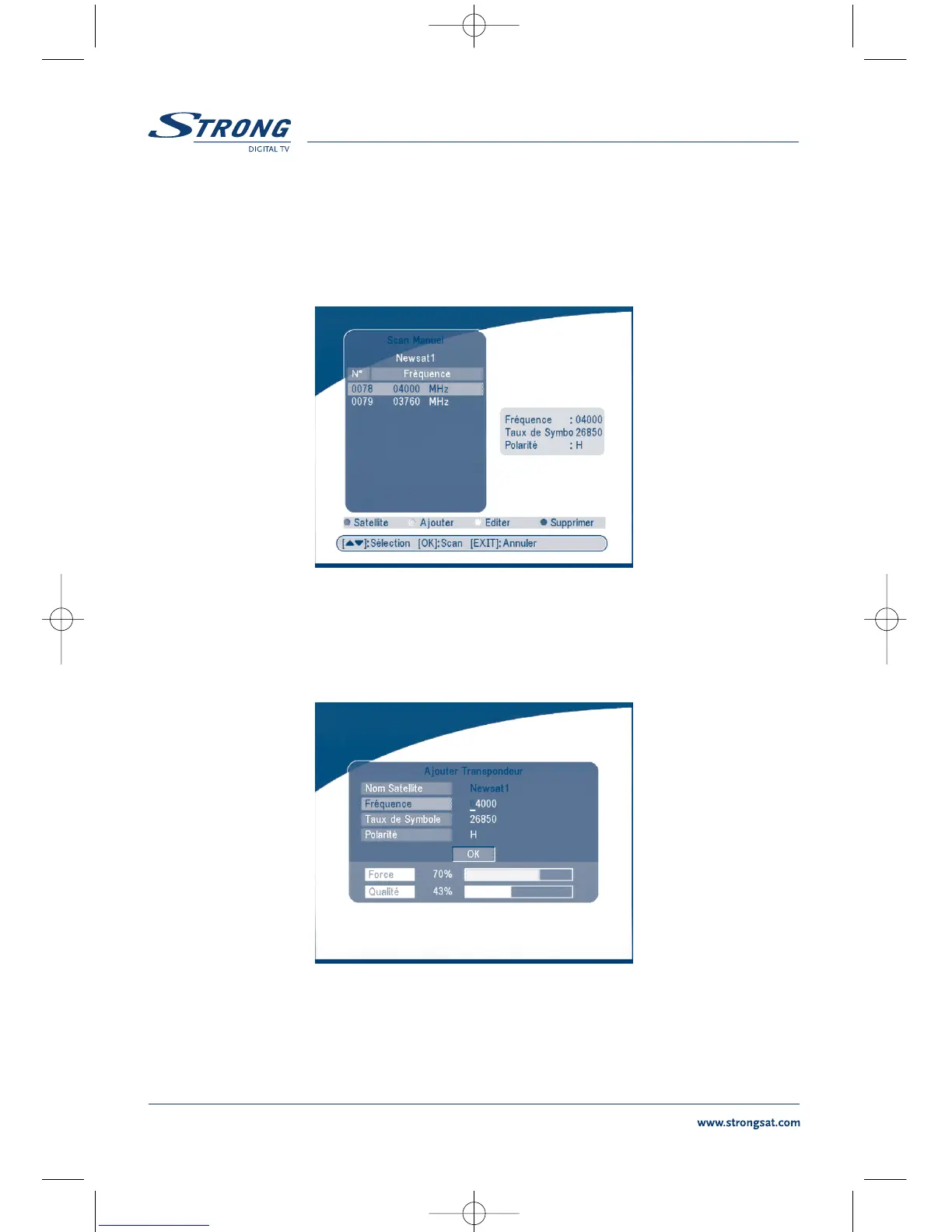 Dans ce menu, vous pouvez ajouter un nouveau transpondeur au système. Appuyez sur le bouton