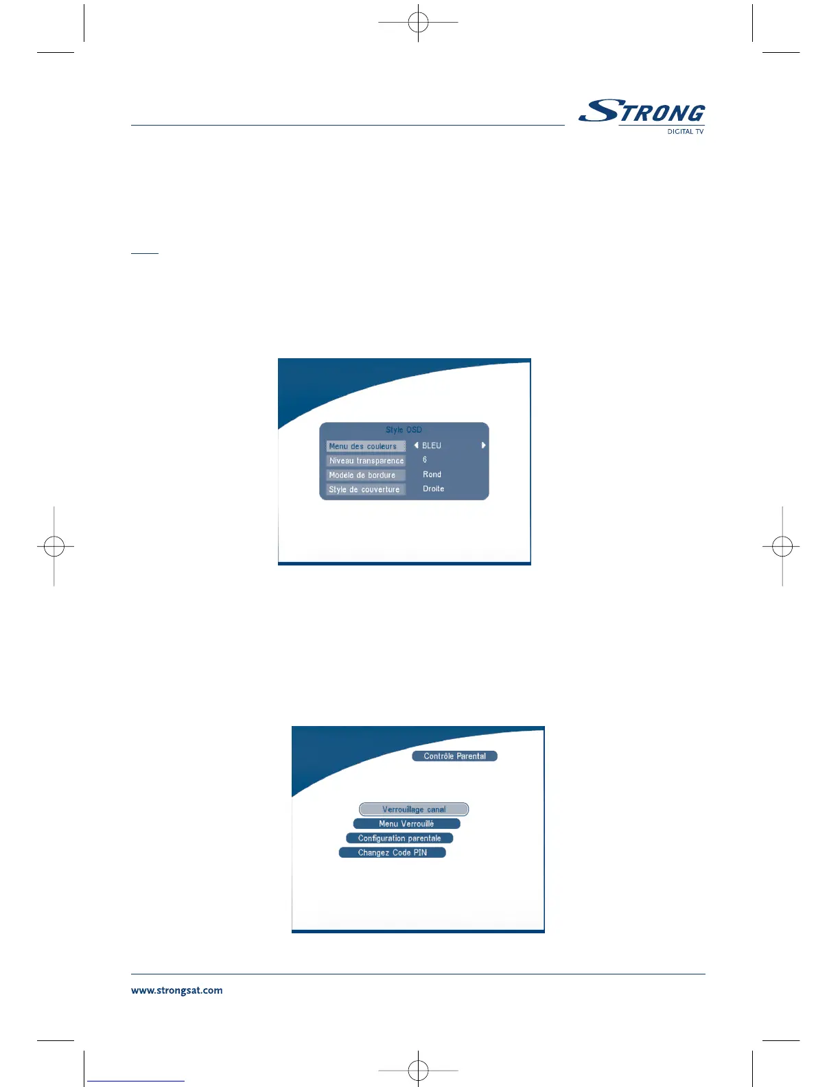 vérouillage du menu, les paramètres parentaux et changer le code PIN (montré sur l'ÉCRAN 40).
