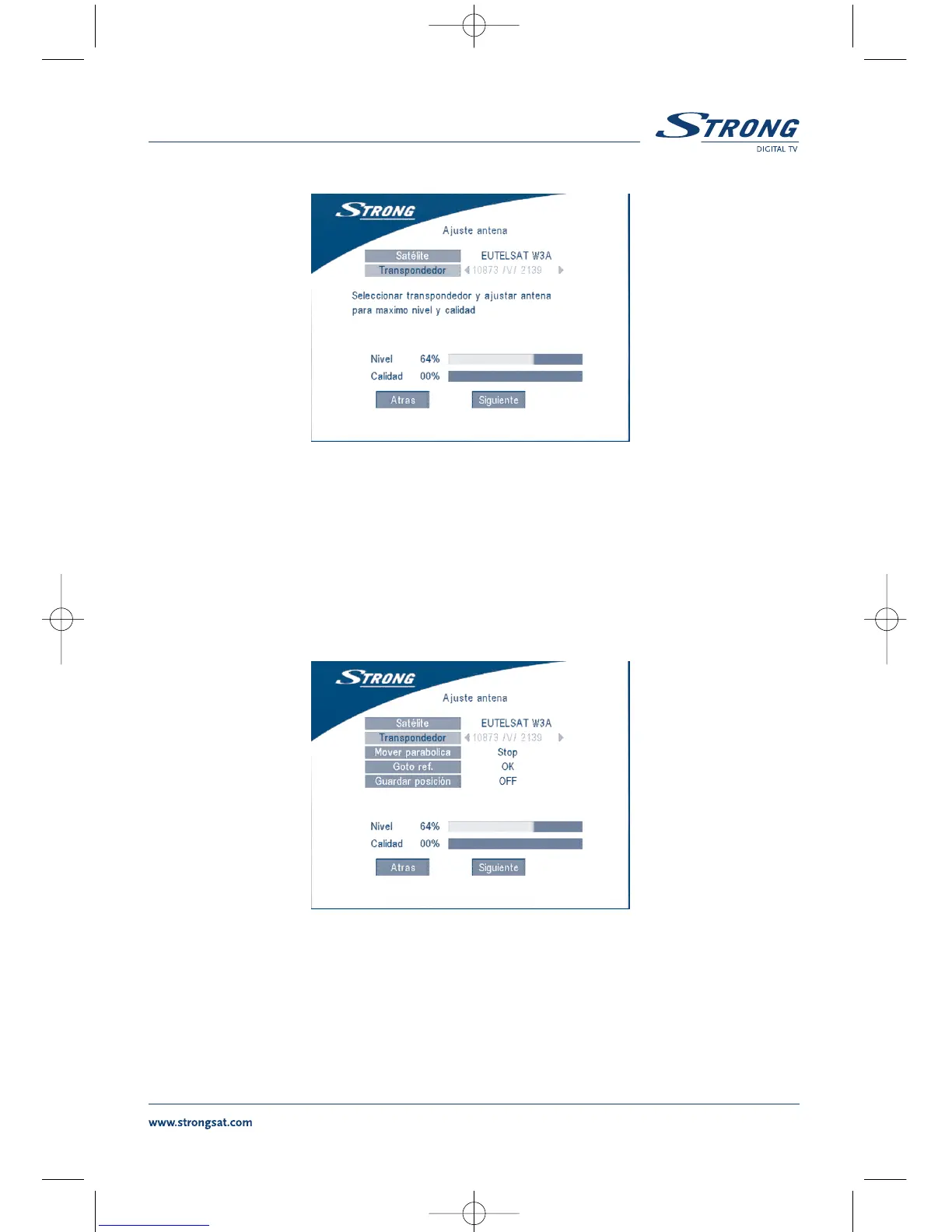 DiSEqC 1.2, seleccionar PROXIMO Y OK. El menú Regulación Antena aparecerá como se