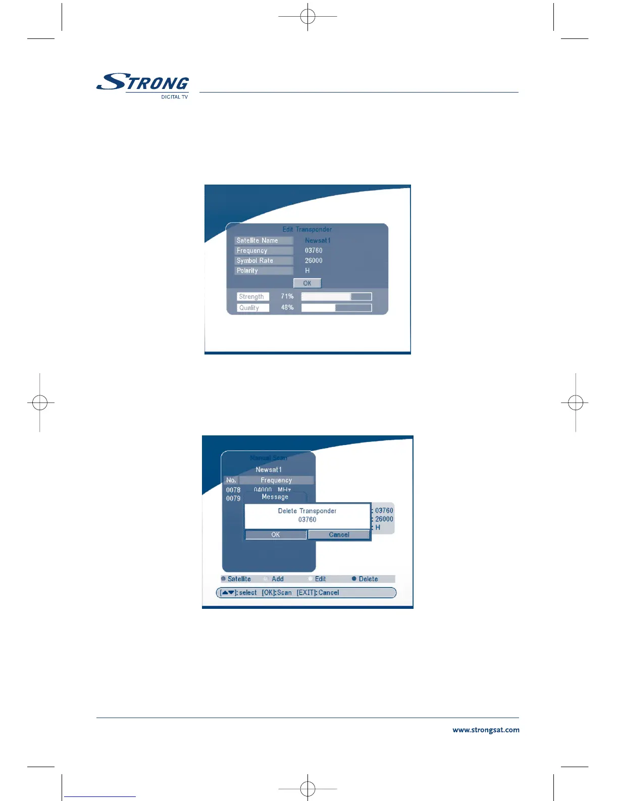 Press the BLUE button to delete a transponder. The warning massage will be shown as below.