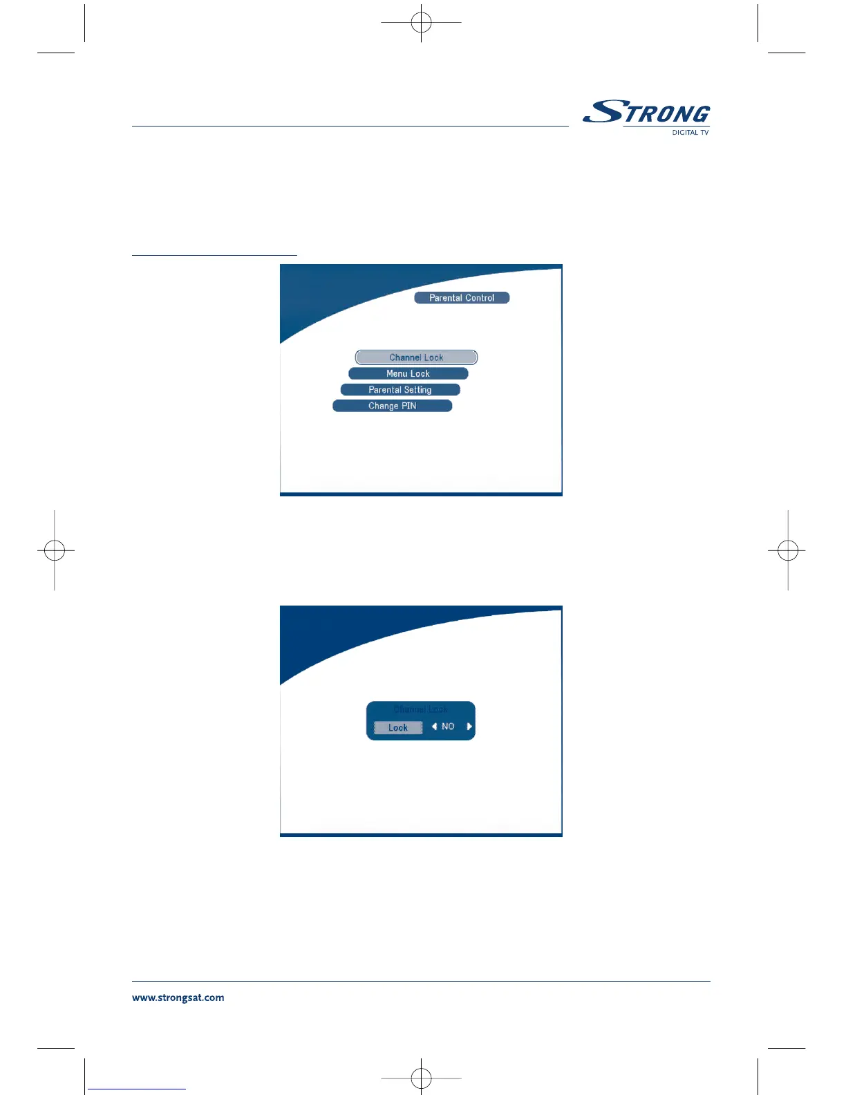 In this menu, you can set channel lock status (ON or OFF), the menu lock status, parental setting and