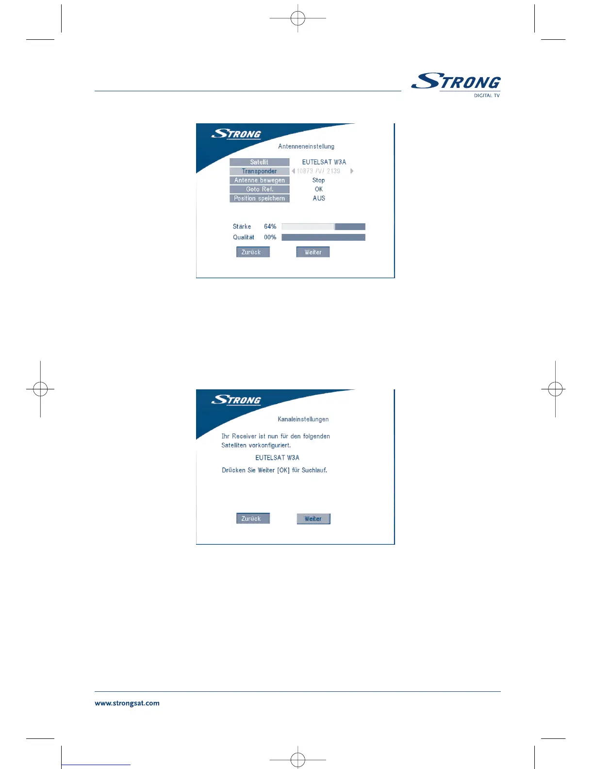 wählen Sie einen entsprechenden Transponder. Im Feld Stärke und Qualität können Sie die korrekte