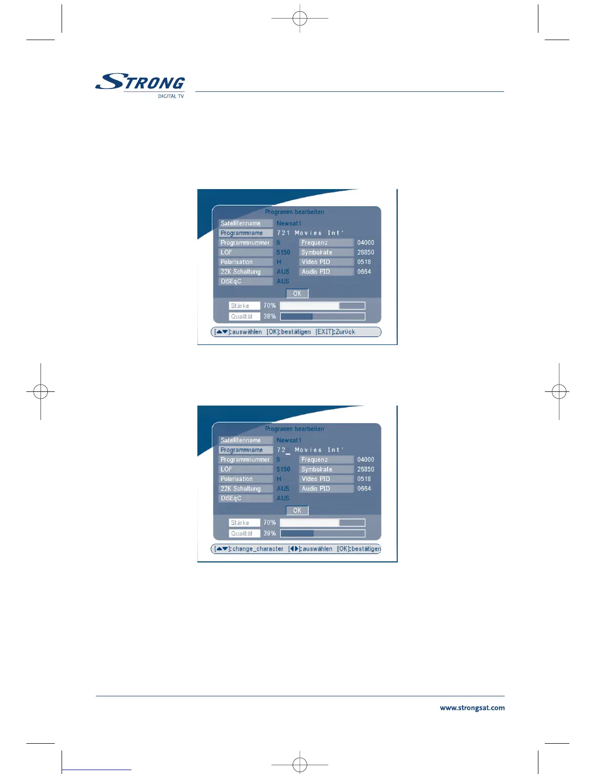 Fernbedienung. Nun können Sie die Frequenz, Symbolrate, Video PID und Audio PID verändern