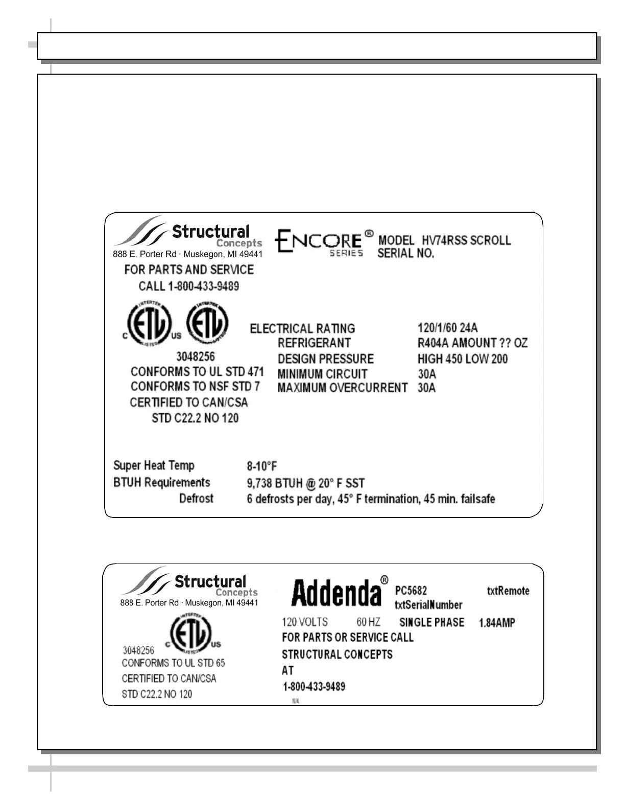 Serial labels contain electrical, temperature & refrigeration information, as well as regulatory