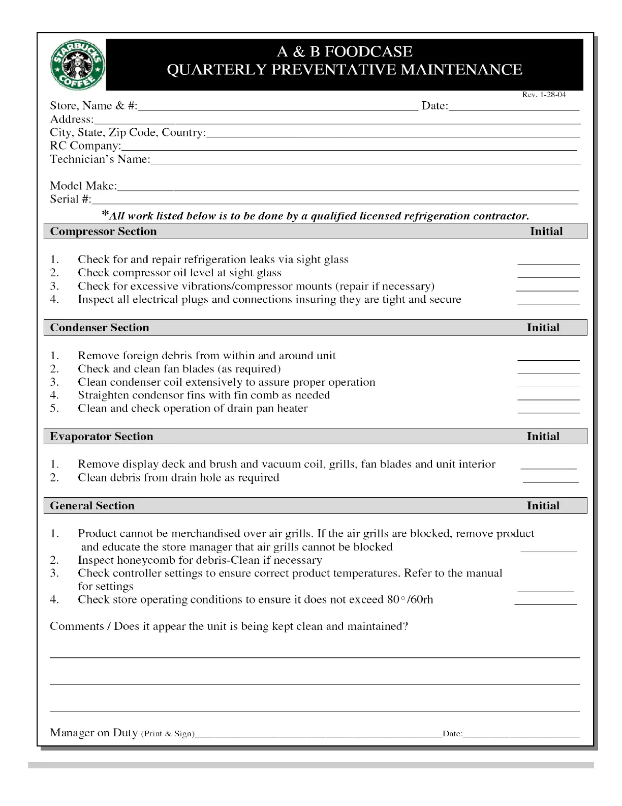 Structural Concepts SB5735 Series - Quarterly Preventative Maintenance Checklist; Compressor Section Checks; Condenser Section Checks; Evaporator Section Checks