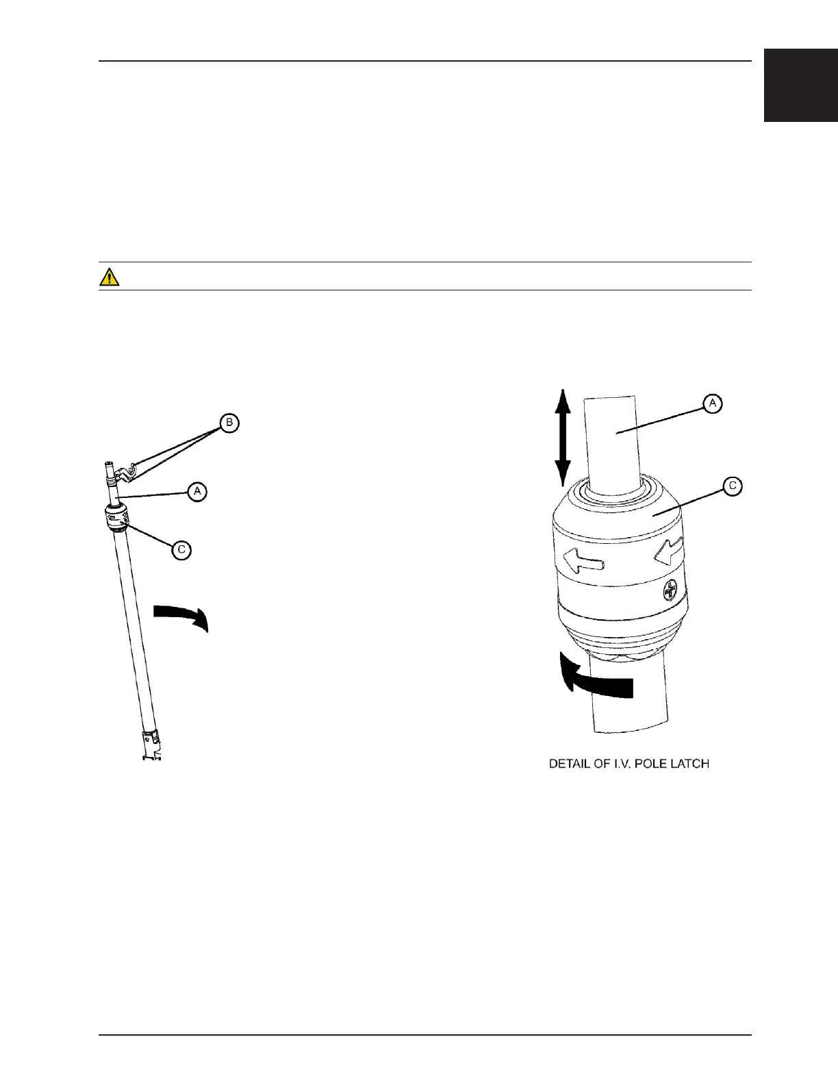 4. To store the I.V. pole, turn the latch (C) clockwise until section (A) lowers. Lift up on