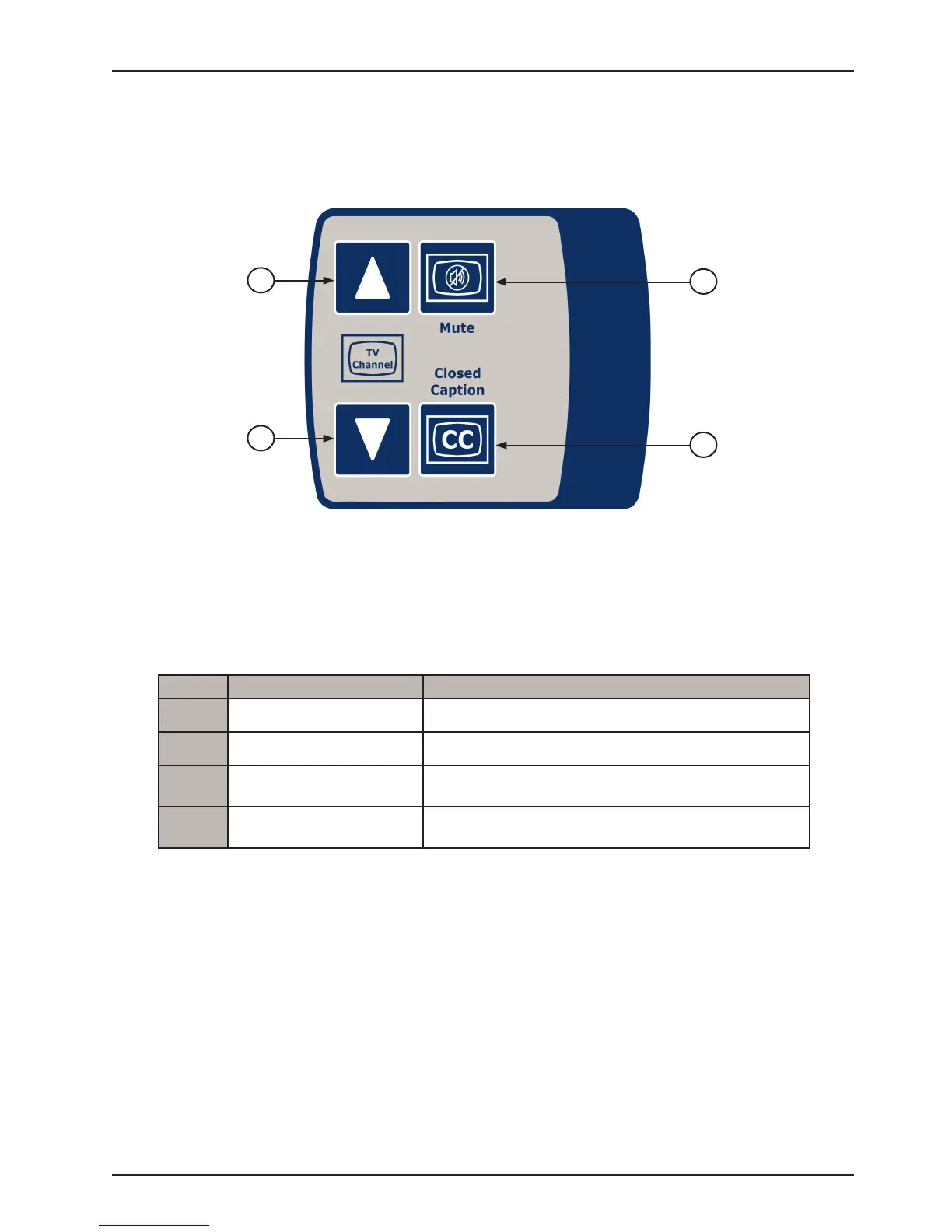 TV Channel Down Press to change TV channel down.