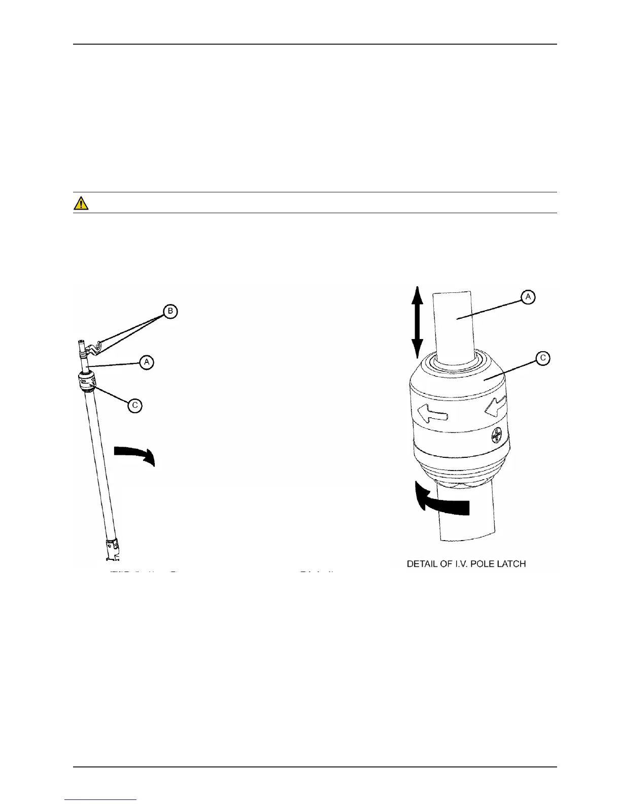 4. To store the I.V. pole, turn the latch (C) clockwise until section (A) lowers. Lift up on