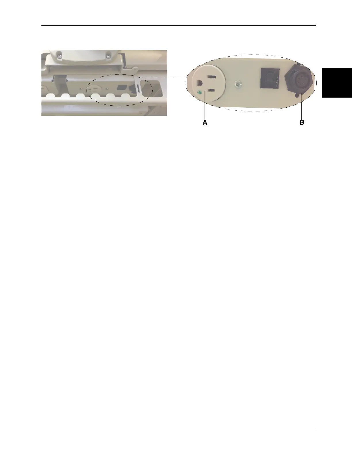 Figure 2-1 : Prise électrique auxiliaire côté pieds du lit InTouch et raccord de matelas