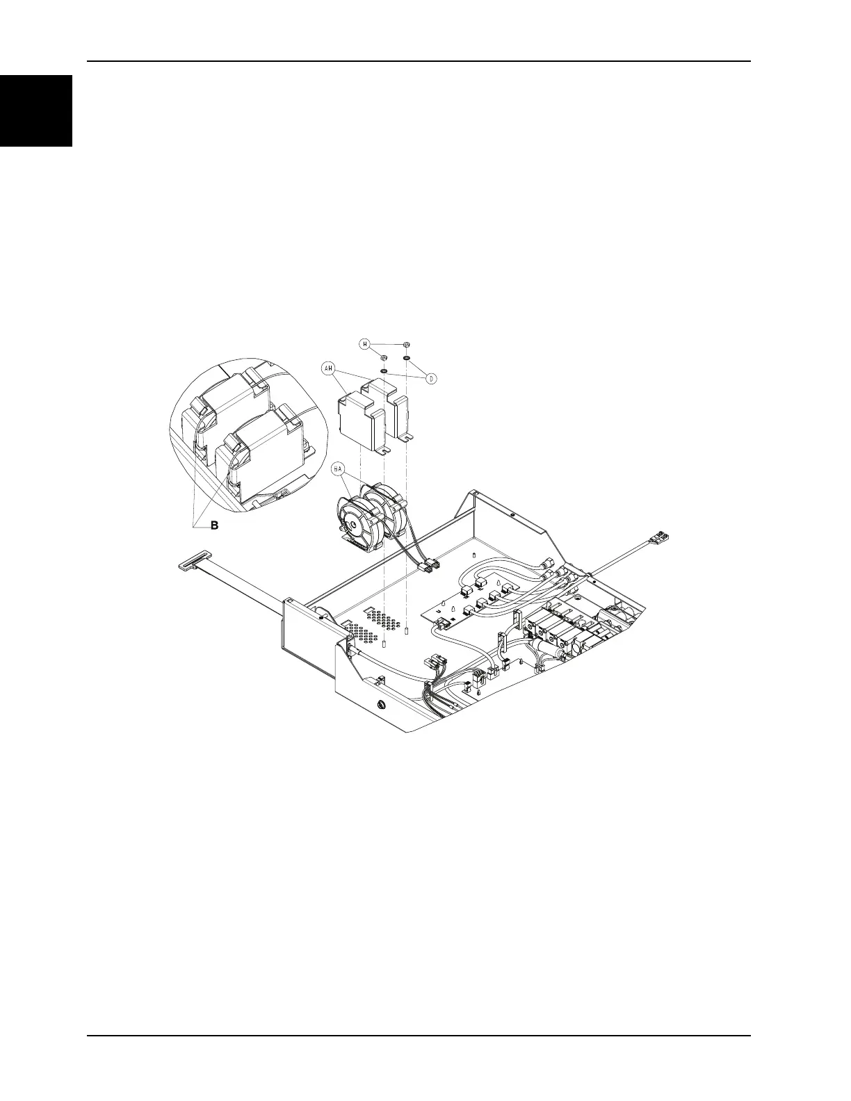 Note: During reinstall, route the fan power cables (BA) over the top of the supplied fan (B) and under the foam tape