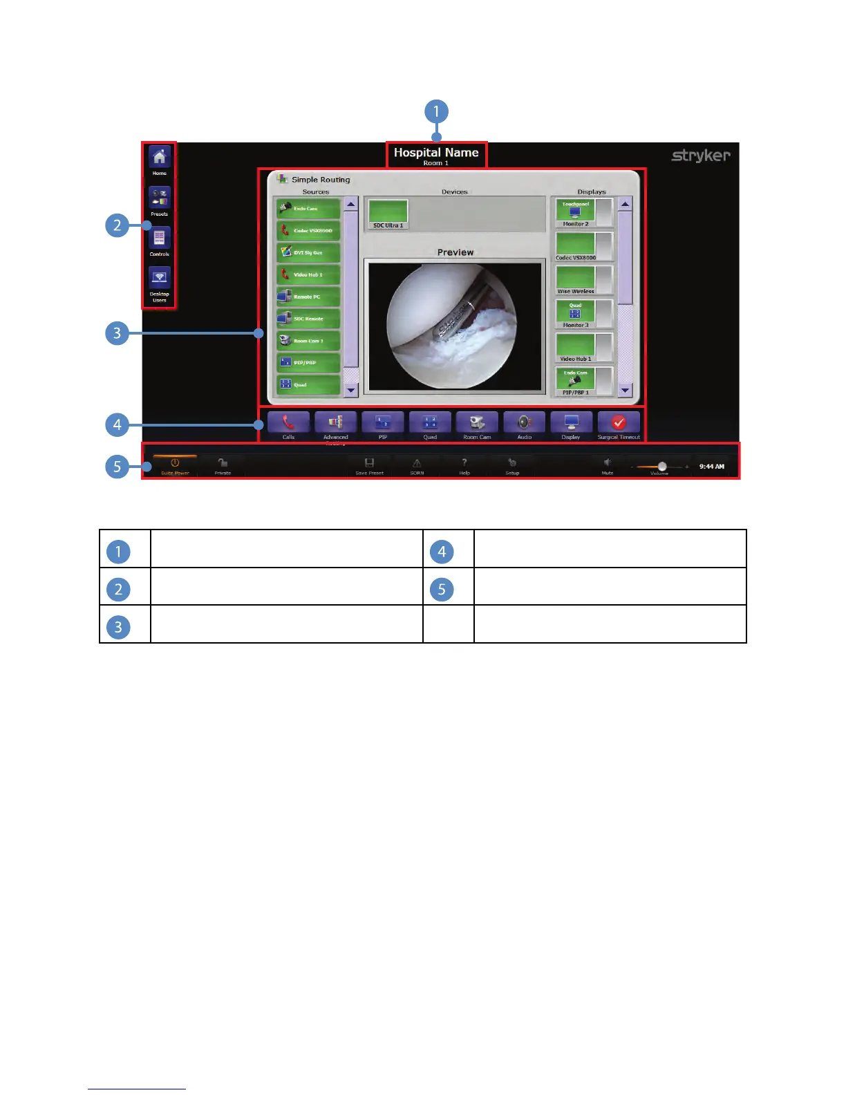 view, QUAD view, Audio, Display, Room Cam, and Surgical Timeout screens. Pressing a