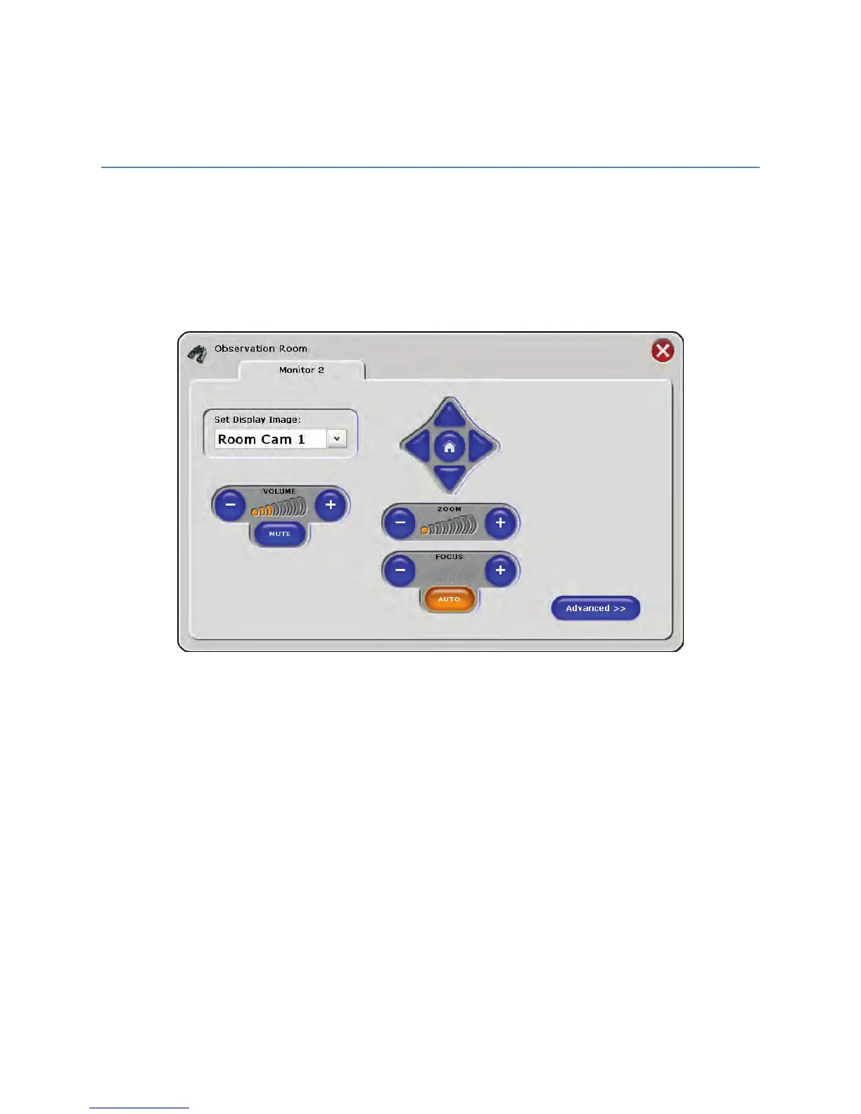 The Observation Room screen controls the speaker volume and video routing for