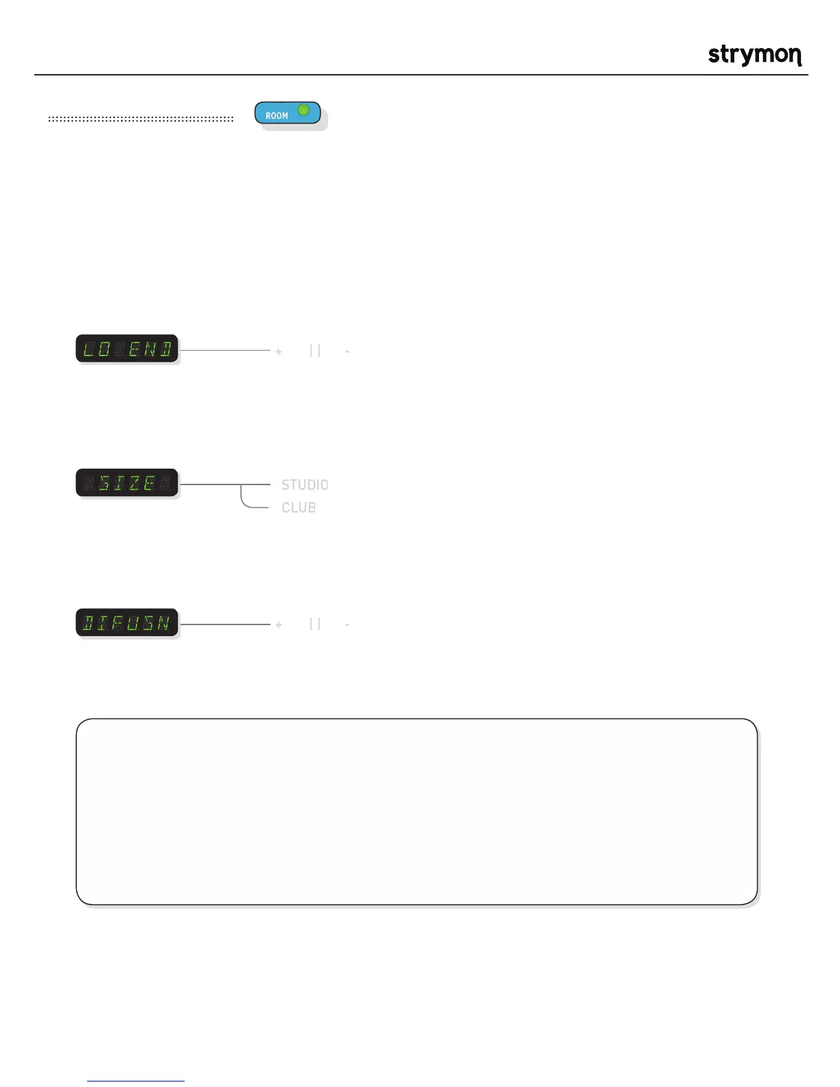 acoustics. The Tone knob, Diffusion and Low End parameters adjust the damping and scattering effects of room materials,