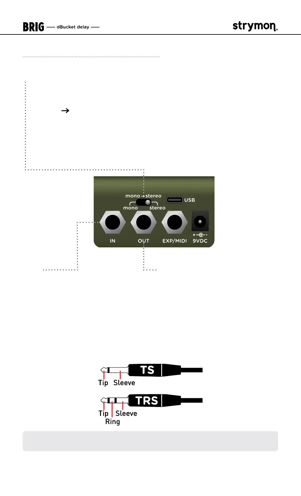 The Brig IN and OUT jacks can accept either TS or TRS type 1/4” cables