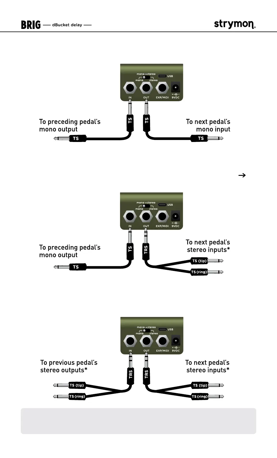 Stereo In - Stereo Out: To connect Brig in a stereo signal chain, use TRS