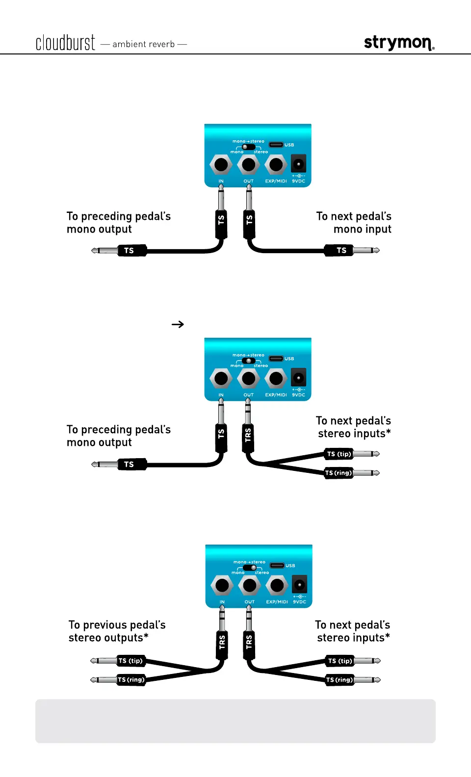 Stereo In - Stereo Out: To connect cloudburst in a stereo signal chain,