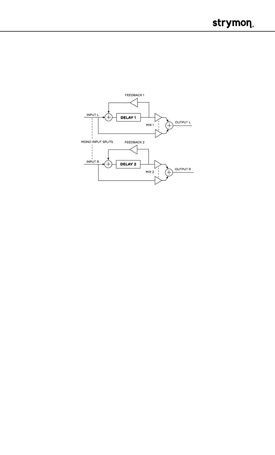 In stereo, Delay 1 outputs to the left channel and Delay 2 outputs to the